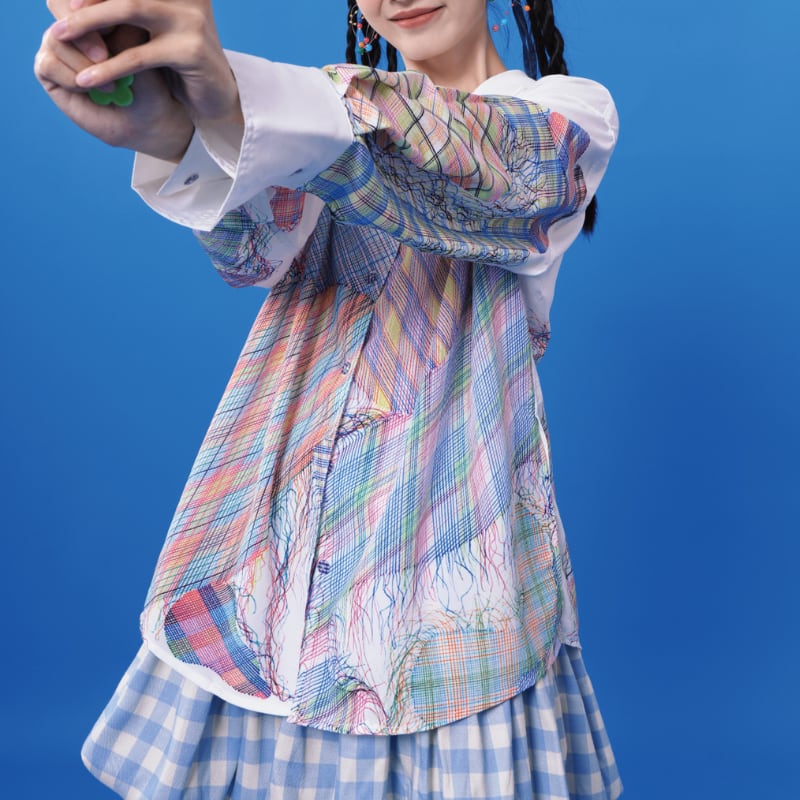 Randomパッチワークのcheck柄シャツ (kai1076)