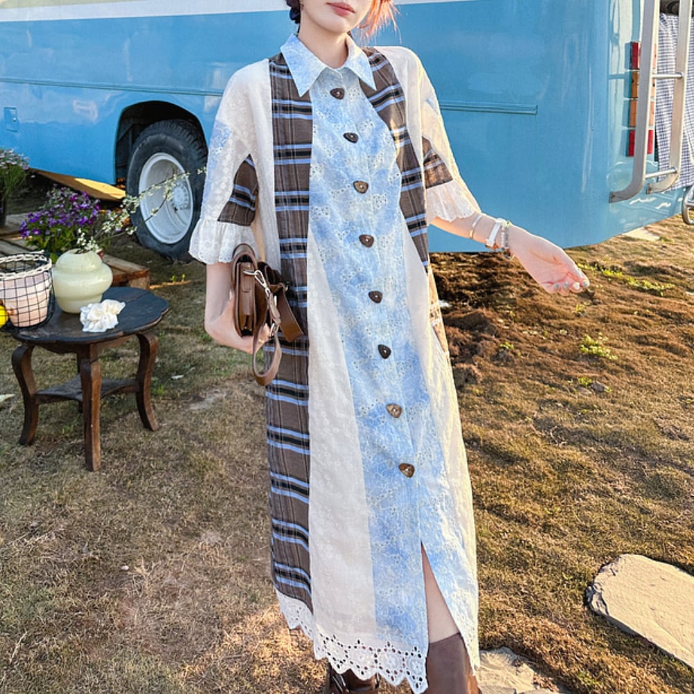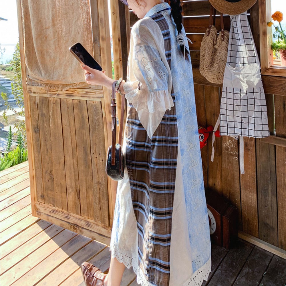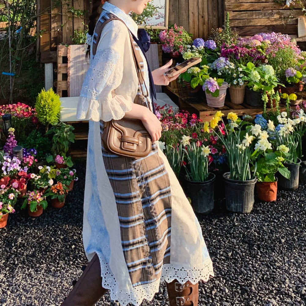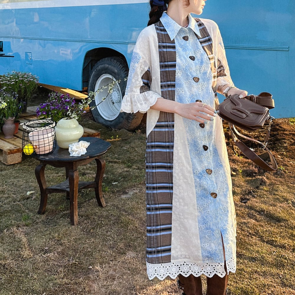 チェック柄のブラウンと水色のコントラストが目を引くシャツワンピース。