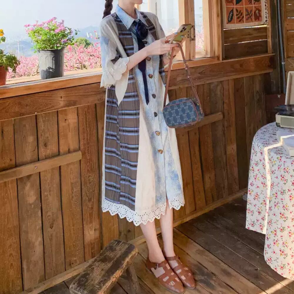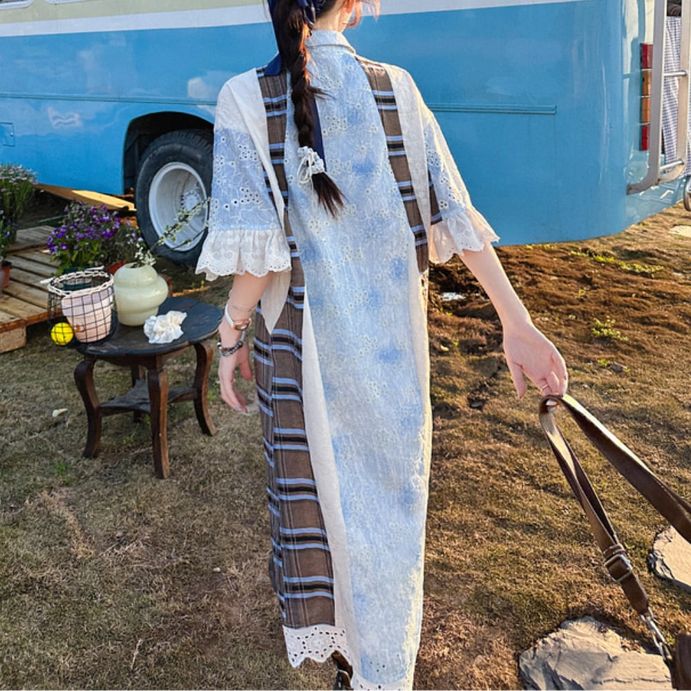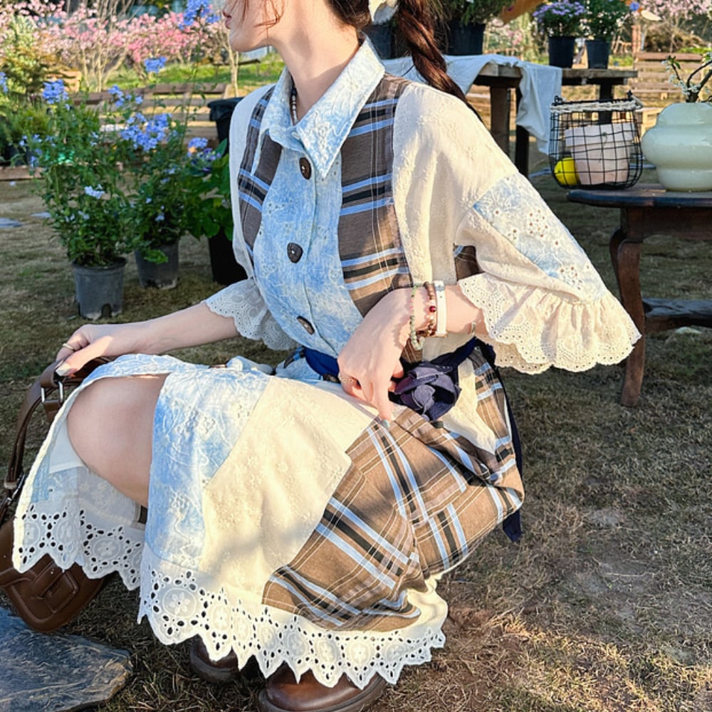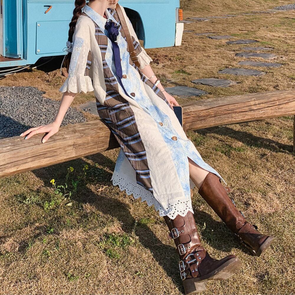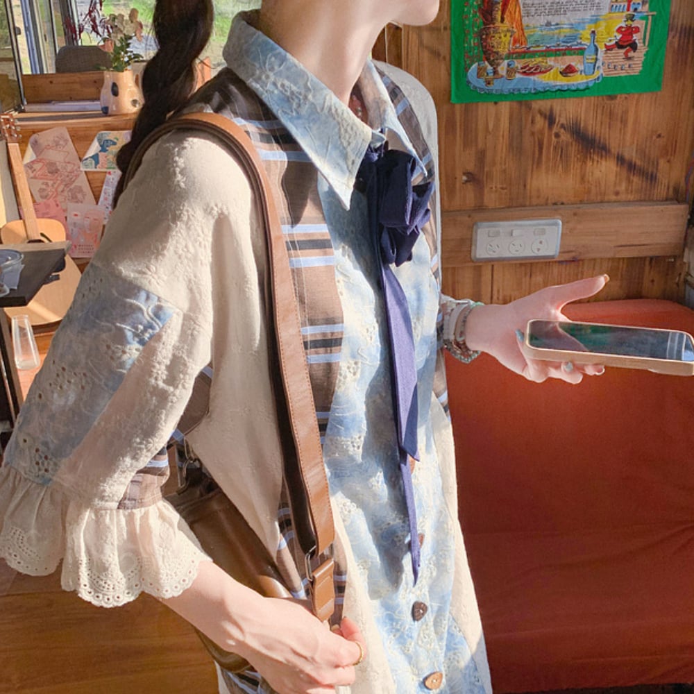 チェック柄のブラウンと水色のコントラストが目を引くシャツワンピース。