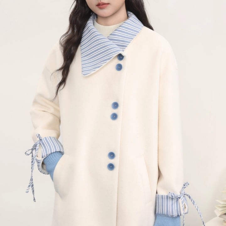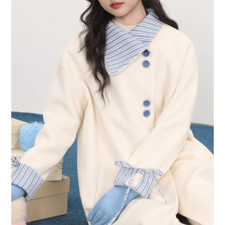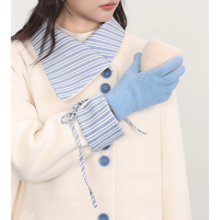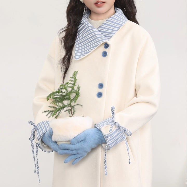爽やかなストライプの大きな襟と袖口リボンが主役。