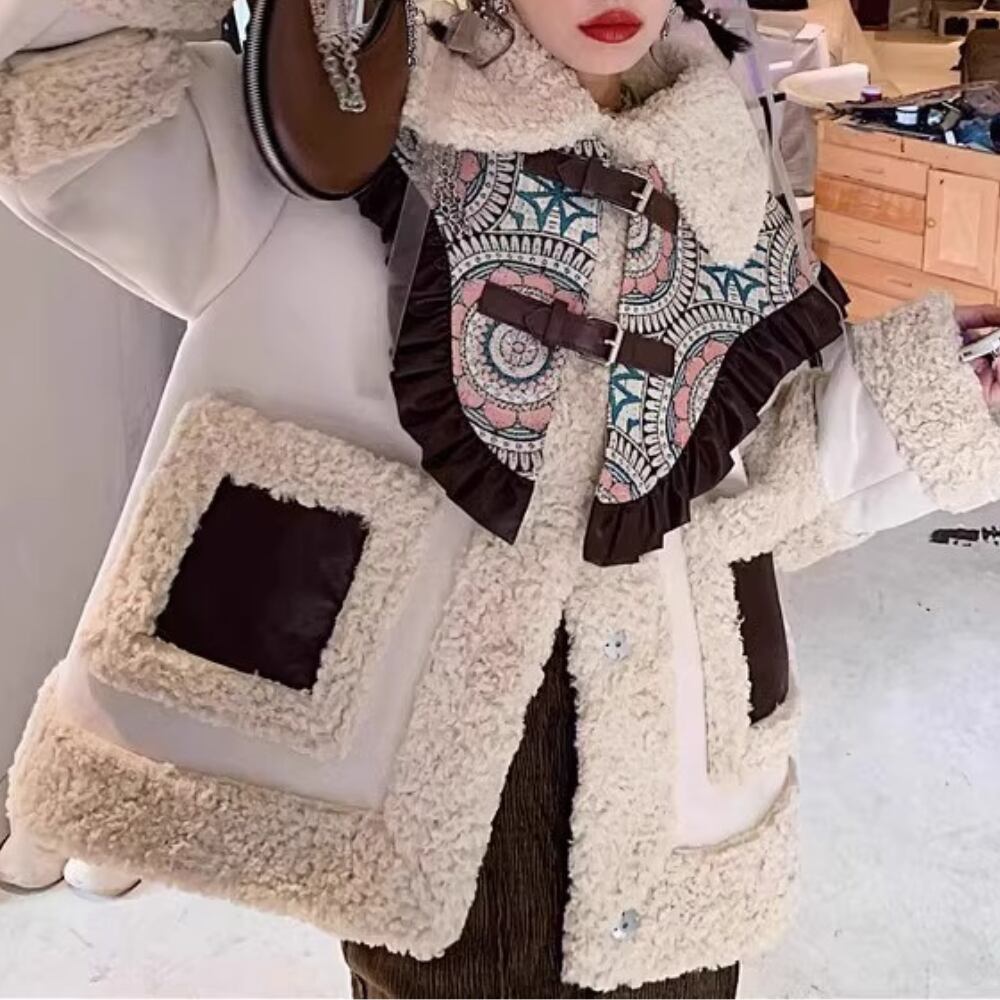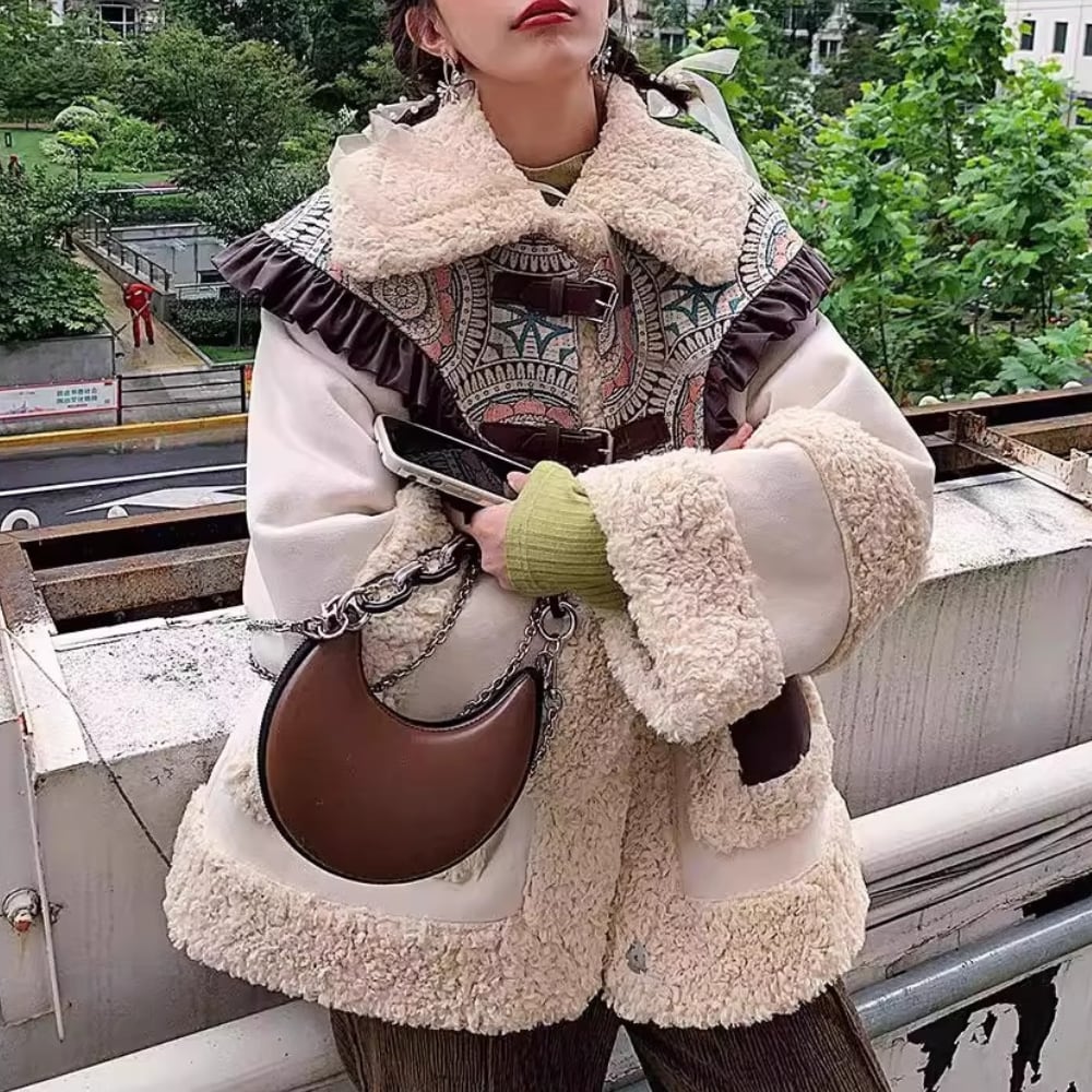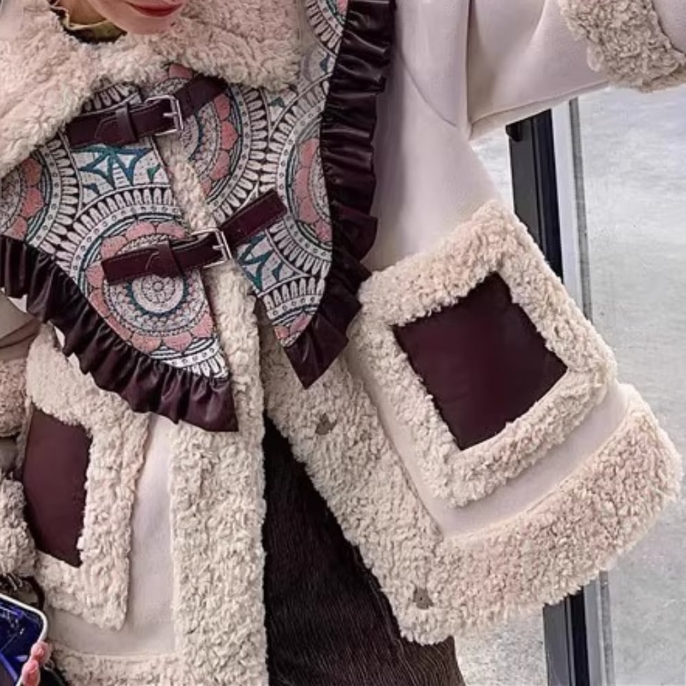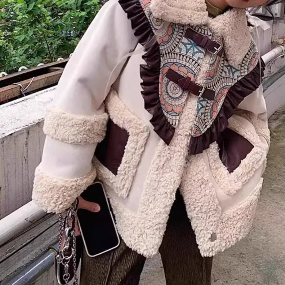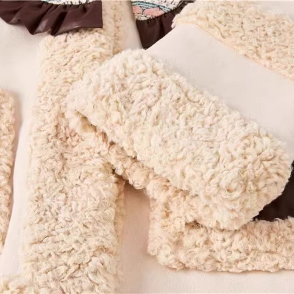 アイボリー×ブラウンの配色が可愛い、ムートン調ボアジャケット。