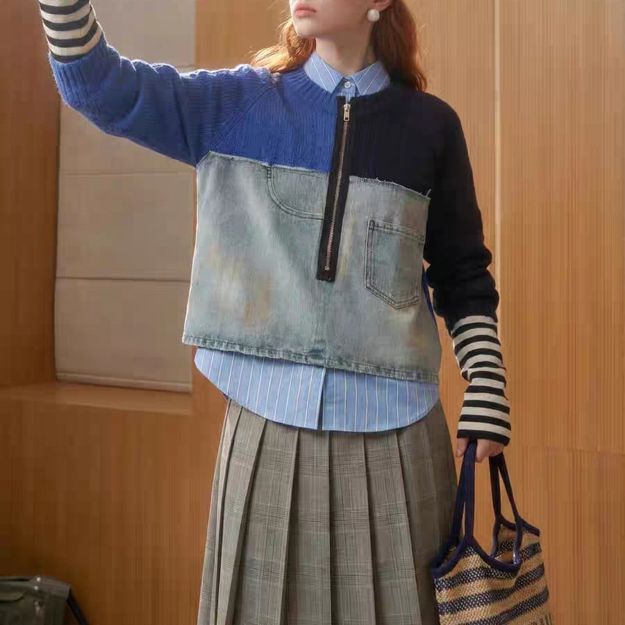 デニムmix クロップド丈 青のknitトップス (kai1233)