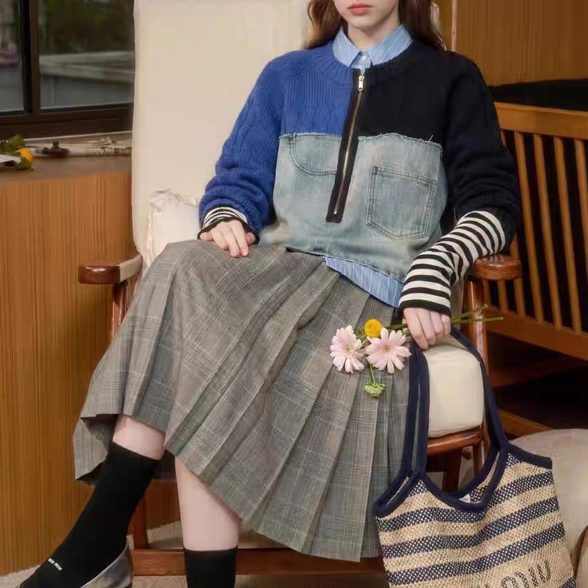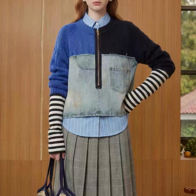 ブルーのグラデーションニットとリメイク風デニムを組み合わせた異素材MIX。