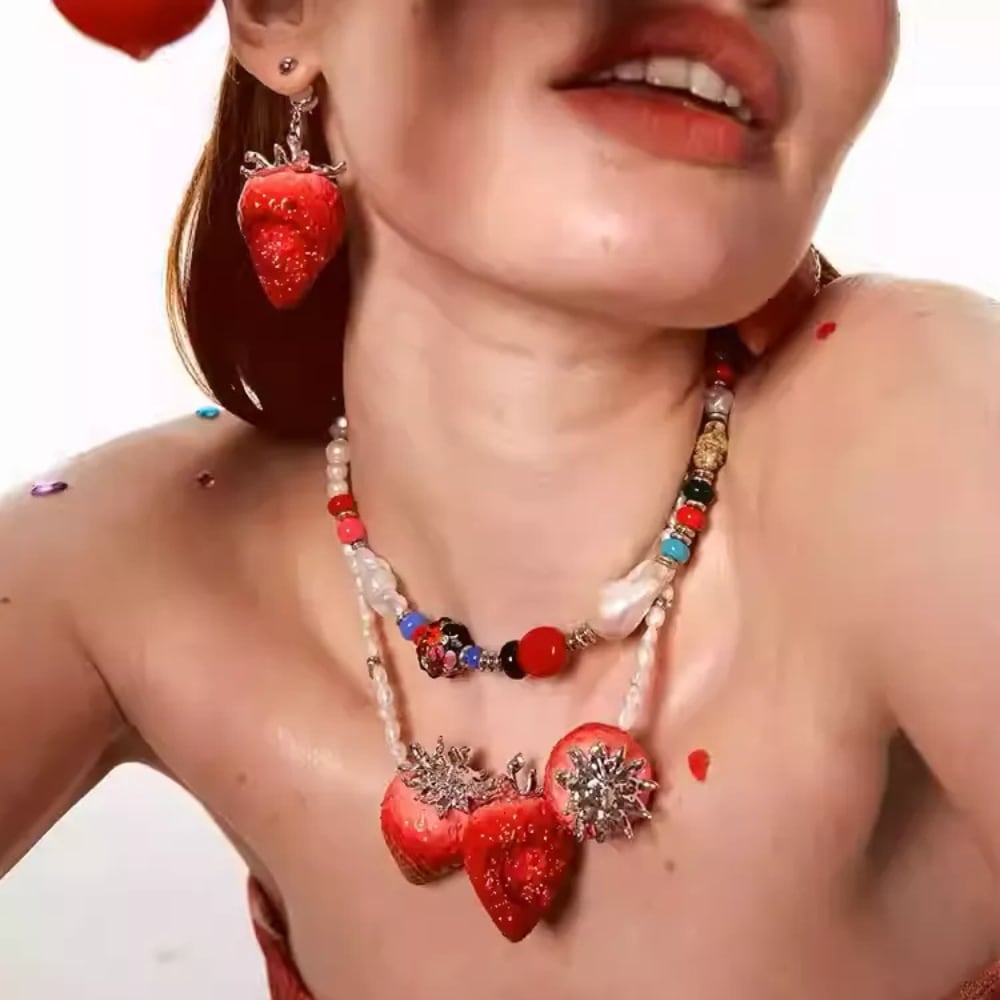 パールチェーンに、リアルでユニークなストロベリーモチーフをドロップさせたネックレス。