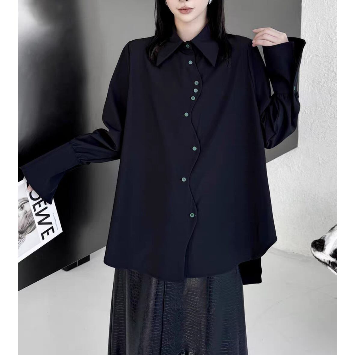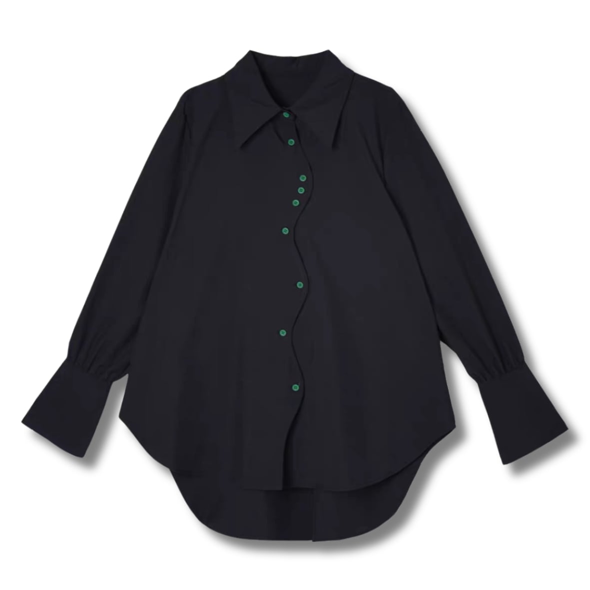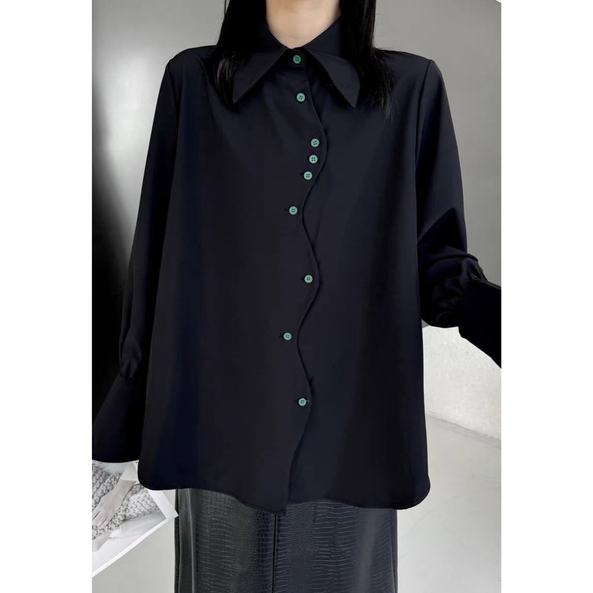 黒にグリーンのボタンが映えるシャツ。