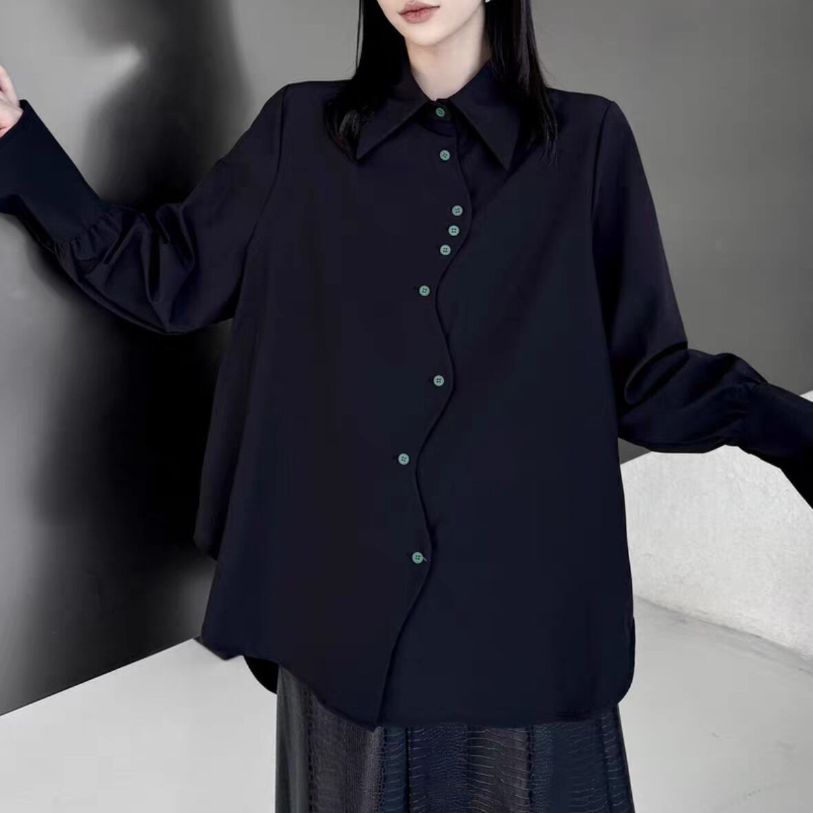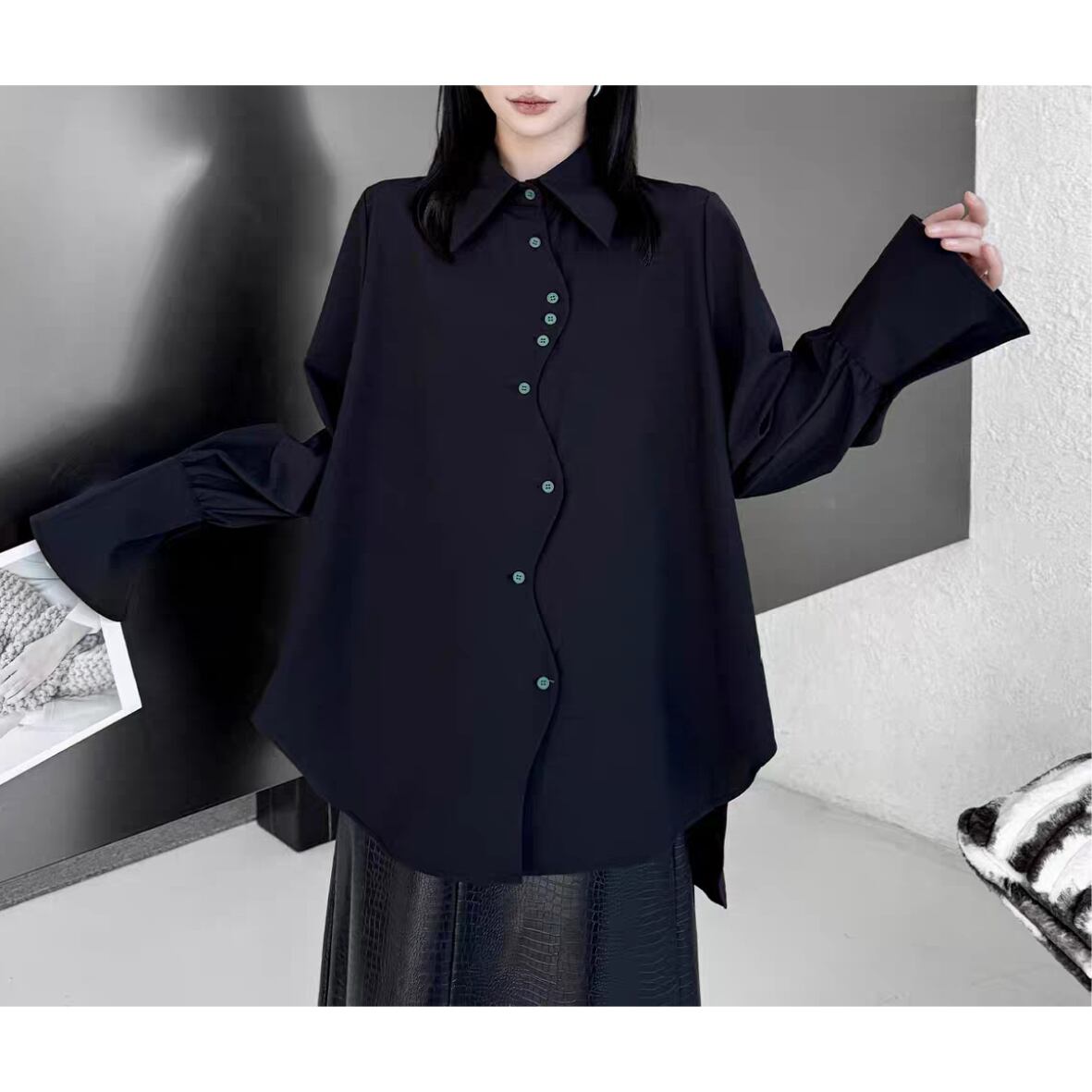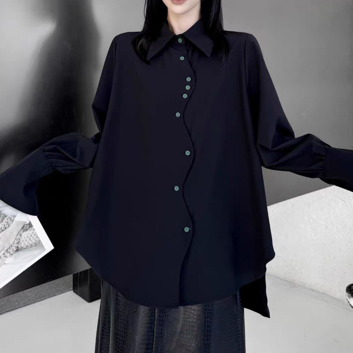黒にグリーンのボタンが映えるシャツ。