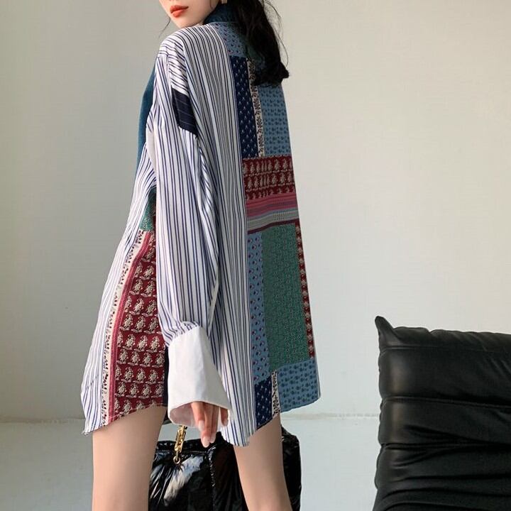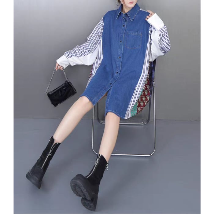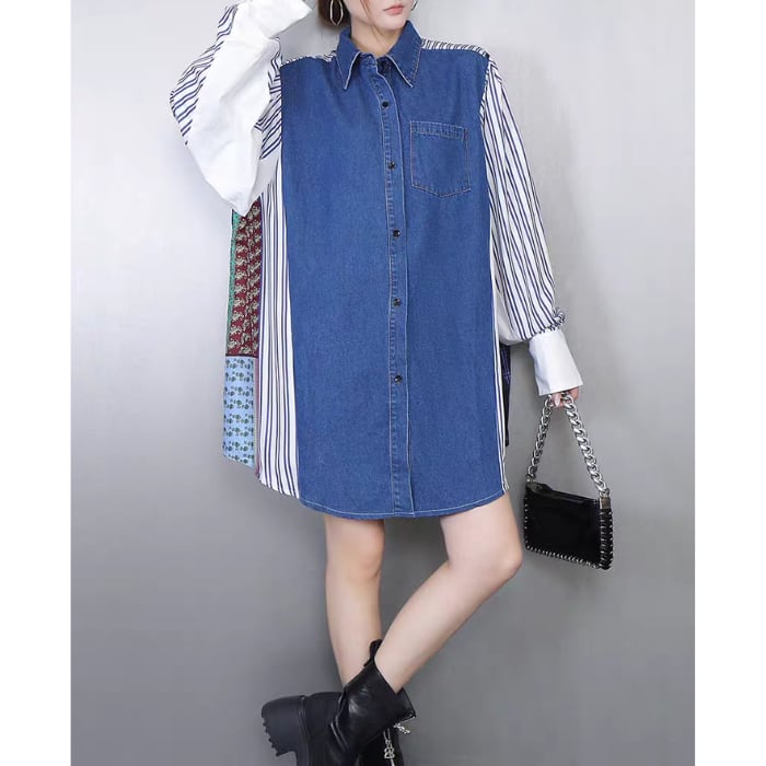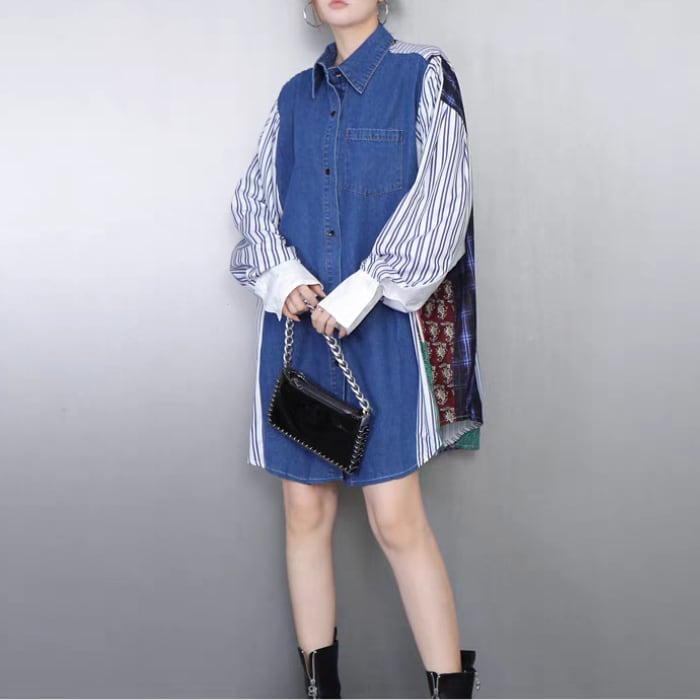 デニムとレトロな柄がドッキング。前後で見え方が異なる遊び心のある1枚。