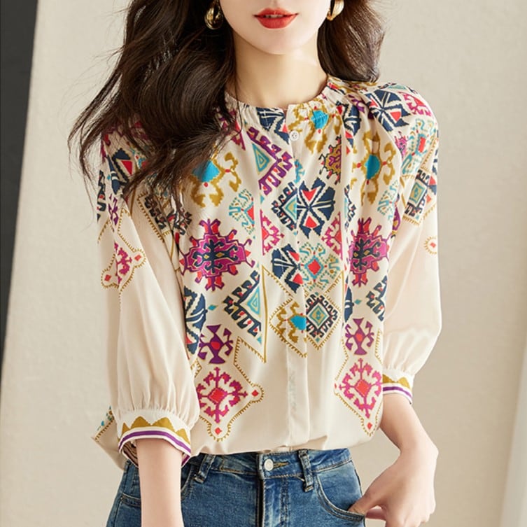 華やかなエスニックプリントが目を惹くブラウス。 ふんわりと美しい袖は七分丈でスッキリ軽やかな1枚☆ 【サイズ】 M 着丈 67cm 肩-袖丈 51cm 胸囲 108cm L 着丈 68cm 肩-袖丈 52cm 胸囲 110cm XL 着丈 69cm 肩-袖丈 53cm 胸囲 112cm 2XL 着丈 70cm 肩-袖丈 54cm 胸囲 114cm 3XL 着丈 71cm 肩-袖丈 55cm 胸囲 116cm ※測り方によって2〜4㎝の差が生じる場合があります。 Shelluits☆トップページはこちら https://shop.shelluits.com/ 姉妹店◆gioielli bouquet ジョイエッリ ブーケ◆はこちら https://shop.gioielli-bouquet.com/ 【お届けについて】 こちらの商品は海外店舗より直接発送となる為、ご入金から 2〜4週間前後で発送致します。 【注意事項】 ・タイミングによっては 商品在庫切れにより 注文キャンセルとさせていただく恐れもございますので、予めご了承くださいませ。 ・こちらは輸入品となります。日本製とは検品基準が異なる為、新品未使用品でもごくわずかな汚れや ほつれがある場合もございます。 ・仕入れ工場を変えることがあるため、記載サイズと若干異なる場合がございます。 ・商品の色味は、お手持ちのスマートフォンの画面によって実物と若干異なる場合がございます。 ・イメージ違いやサイズ交換等、お客さまご都合による交換、返品は対応出来かねますので ご了承ください。 **。**。**。**。**。**。**。 ↓ご購入前にこちらをお読みください https://shop.shelluits.com/about **。**。**。**。**。**。**。