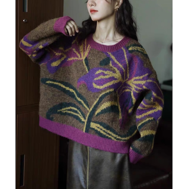 レインボーカラーのジグザグ模様が目を引くニットカーディガン。